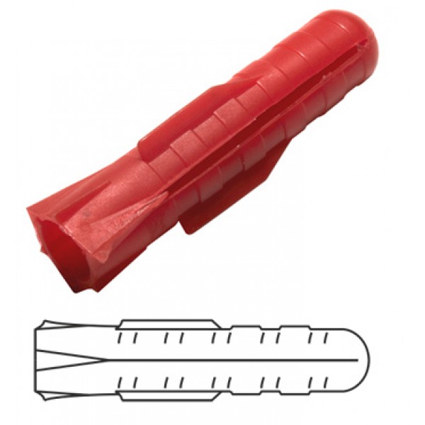 Дюбель красный, тип Т 6 * 35 - Предназначен для всех видов материалов из бетона и кирпича. Три распорных сегмента не позволяют шурупу соскальзывать в стороны, что имеет немаловажное значение при работе с шуруповертом. Силы, под воздействием которых происходит распирание дюбеля, распределены внутри отверстия более равномерно, что повышает показатели рабочих нагрузок.