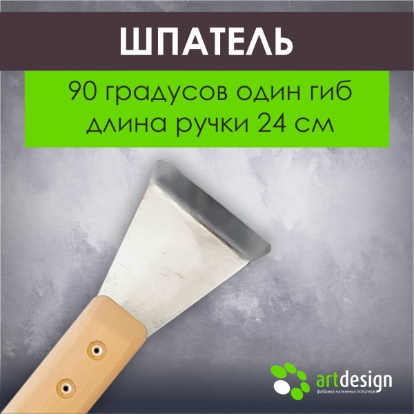 Шпатель 90 градусов один гиб длина ручки 40 см - шпатель закарнизный имеет трапециевидную рабочую часть с одним гибом 90º. Лопатка из закаленной стали толщиной 1,5 мм является жесткой и прочной. Применяется для заправки плёнки в ступенчатые багеты или гипсокартонные короба при устройстве многоуровневых конструкций и конструкций со скрытой подсветкой. Шпатель с длинной рукояткой 40 см и с одним гибом хорошо подходит для закарнизного багета, для парящих профилей. Вес шпателя 250 граммов.
