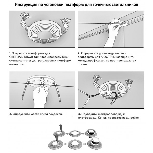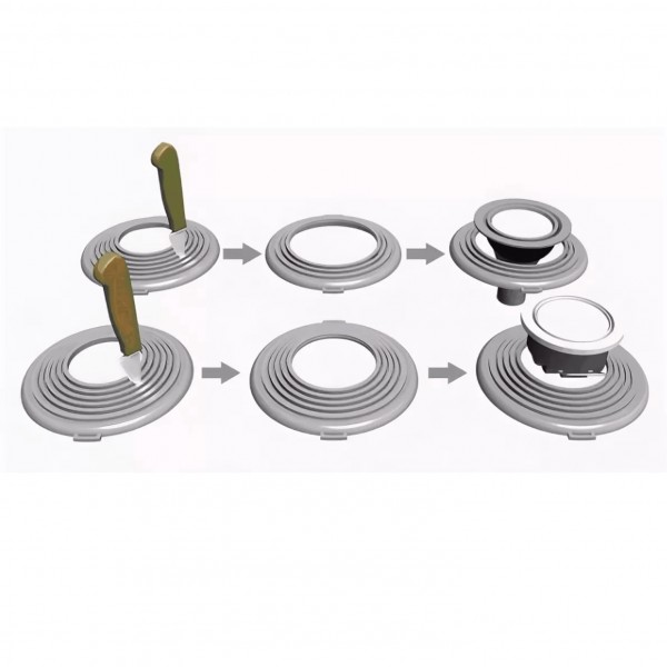 Платформа универсальная предназначена для крепления встраиваемых моделей светильников. Универсальные платформы имеют ступенчатообразную форму и состоят из некоторого количества колец. Для крепления светильника вырезается кольцо нужного размера. При этом выполняется срезание нужного количества колец.