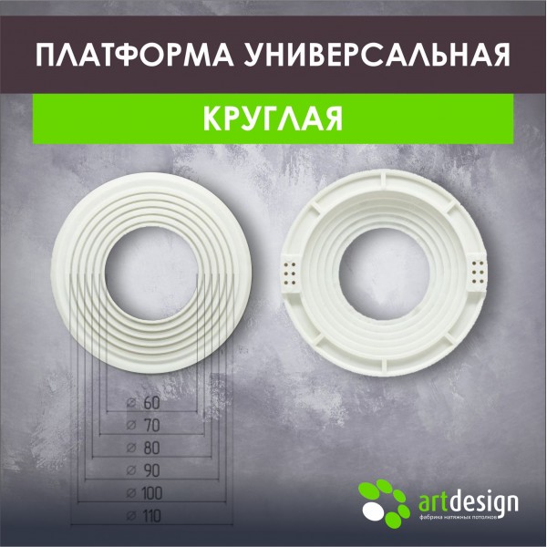 Платформа универсальная предназначена для крепления встраиваемых моделей светильников. Универсальные платформы имеют ступенчатообразную форму и состоят из некоторого количества колец. Для крепления светильника вырезается кольцо нужного размера. При этом выполняется срезание нужного количества колец.
